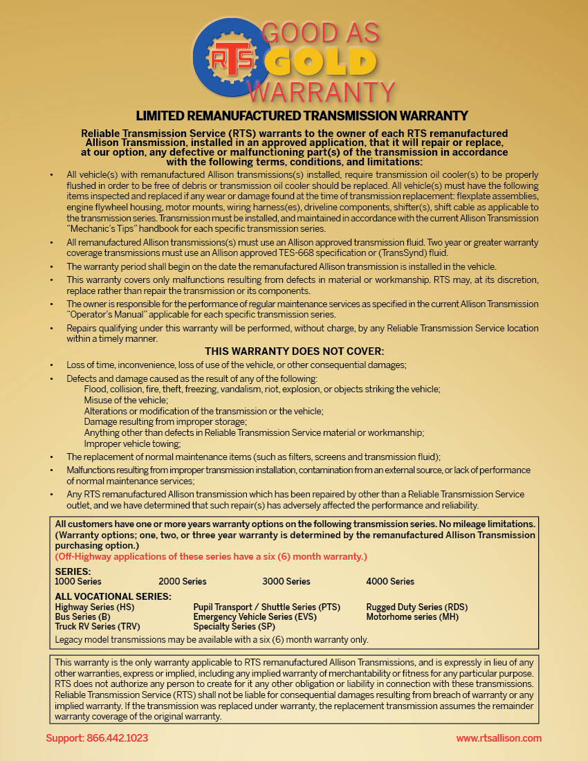After 40+ years of remanufacturing only Allison transmissions, you can trust at RTS, we build them to operate like brand-new. That’s why we confidently offer our “Good as Gold” warranty. We believe the best warranty is the one never used, and ours rarely is, providing the maximum uptime you should expect from a remanufactured Allison transmission. Should an issue occur with one of our transmissions, we will expediently correct the issue to minimize your downtime, and fully investigate the cause to prevent repeat occurrences.